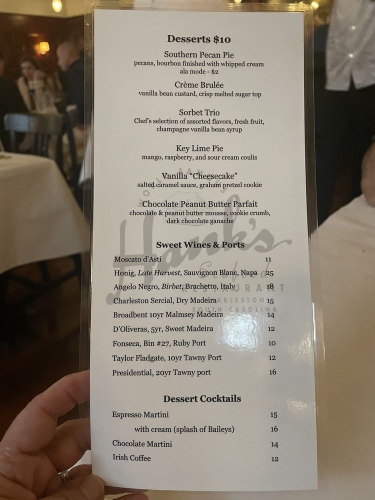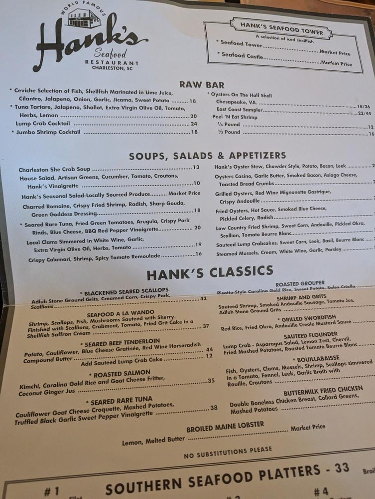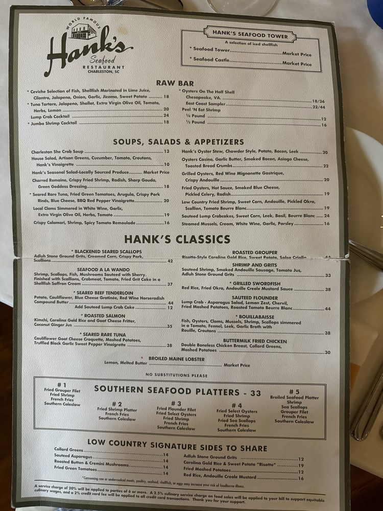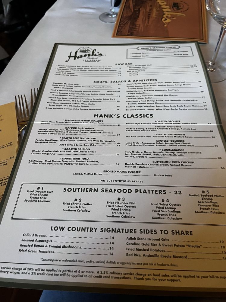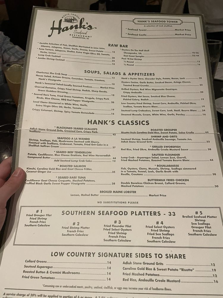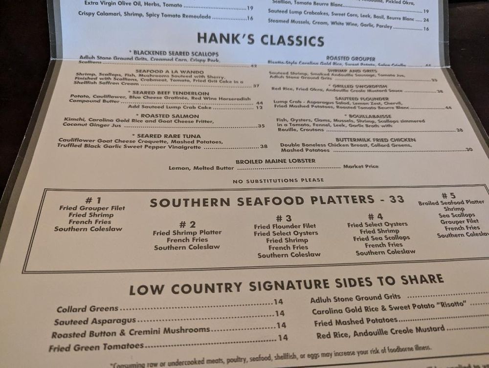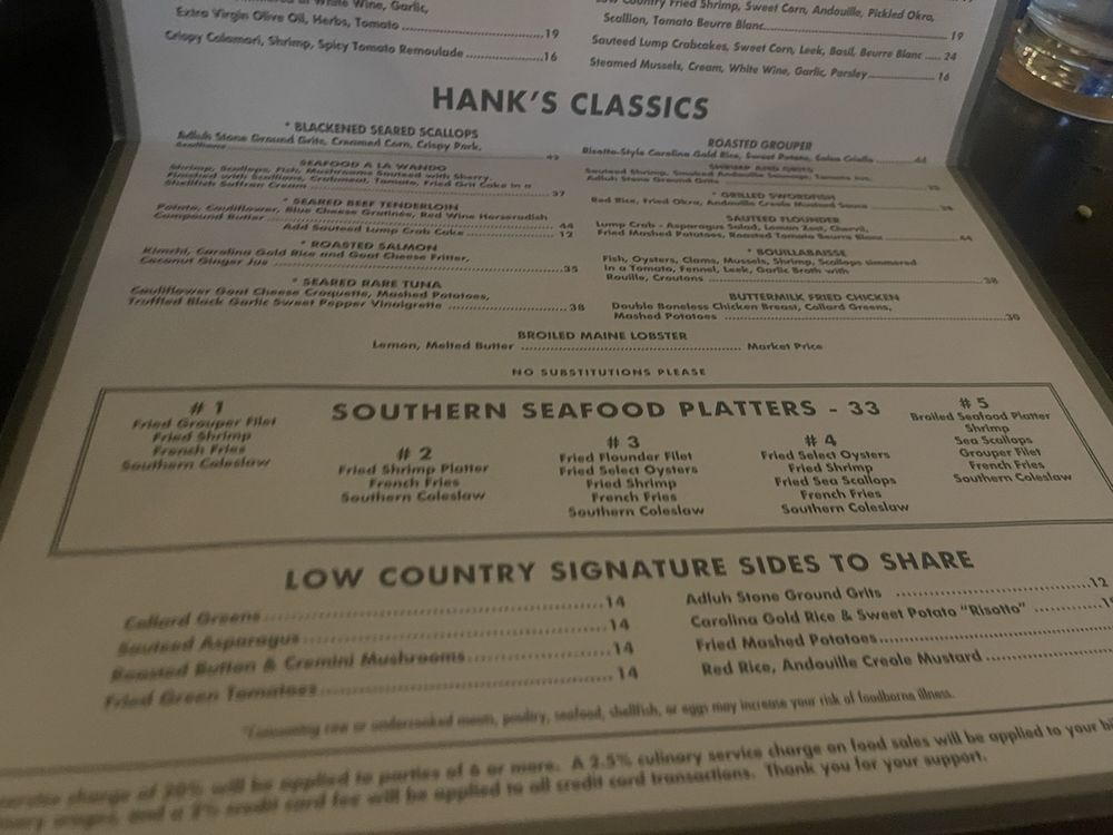 Introducing the menu at Hank's Seafood Restaurant in Charleston, SC, where you'll find a classic old haunt with a packed atmosphere. Offering a variety of seafood options, from oyster stew to shrimp and grits, Hank's is known for its fresh and flavorful dishes. Customers rave about the seafood La Wando, the she crab soup, and the signature shrimp and grits in a tomato broth. The ambiance is highlighted by dark coastal-themed decor, perfect for a classy dining experience. Service is top-notch, with professional servers who are quick to recommend dishes. The restaurant also offers a gluten-free menu and is great for both small and large parties. Prices may be on the higher side, but the quality of the food and the dining experience make it worth it. Don't miss out on the chance to indulge in fine seafood dining at Hank's Seafood Restaurant.